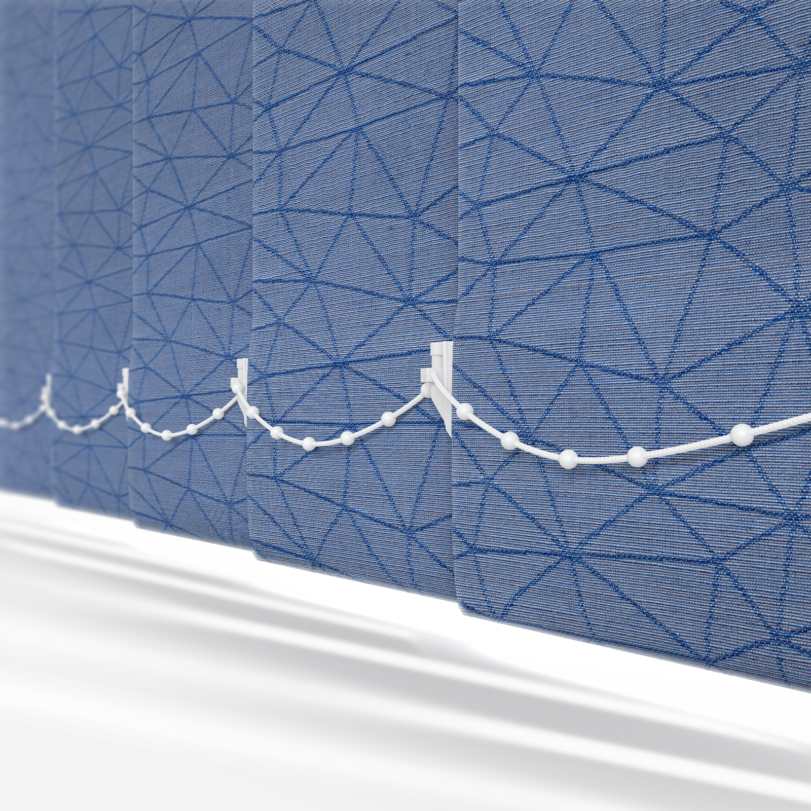 This vertical blind displays an attractive patterned design, along with a pleasant ocean shade that brings style and excitement to the space.
