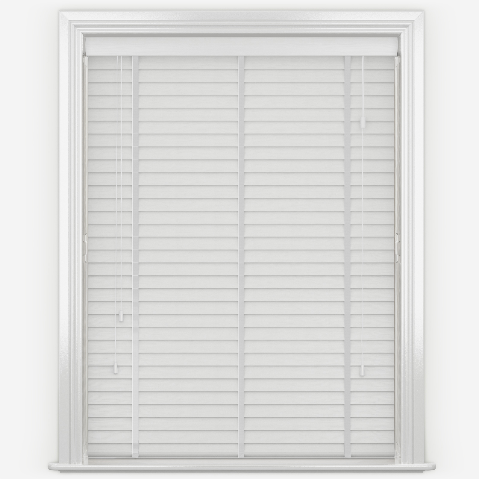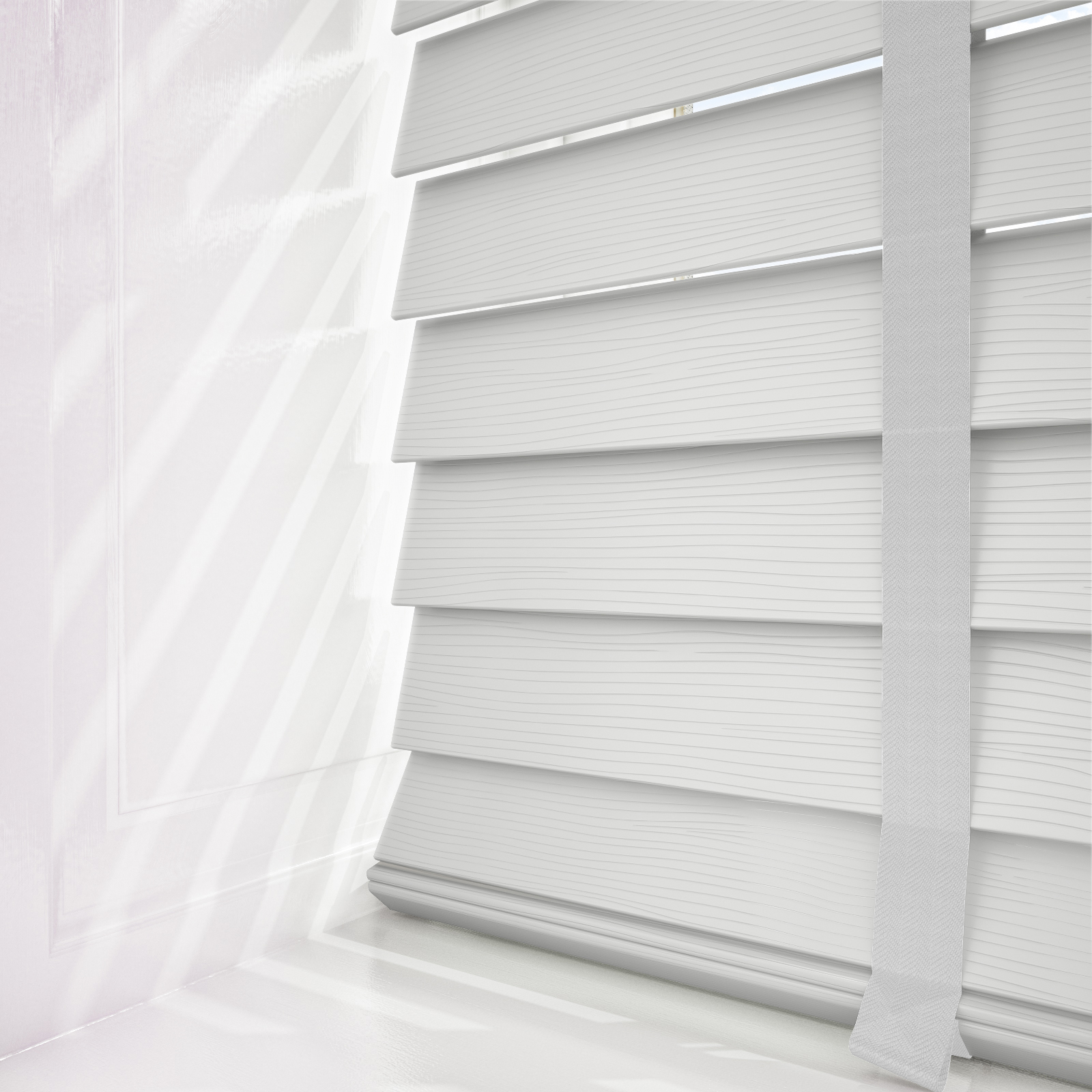 This gorgeous bright white faux wood blind, with its fine grain effect and sleek finish, captures the look of natural wood without any of the disadvantages. Its charming complementary white tapes make this made to measure blind a stylish and versatile window dressing.