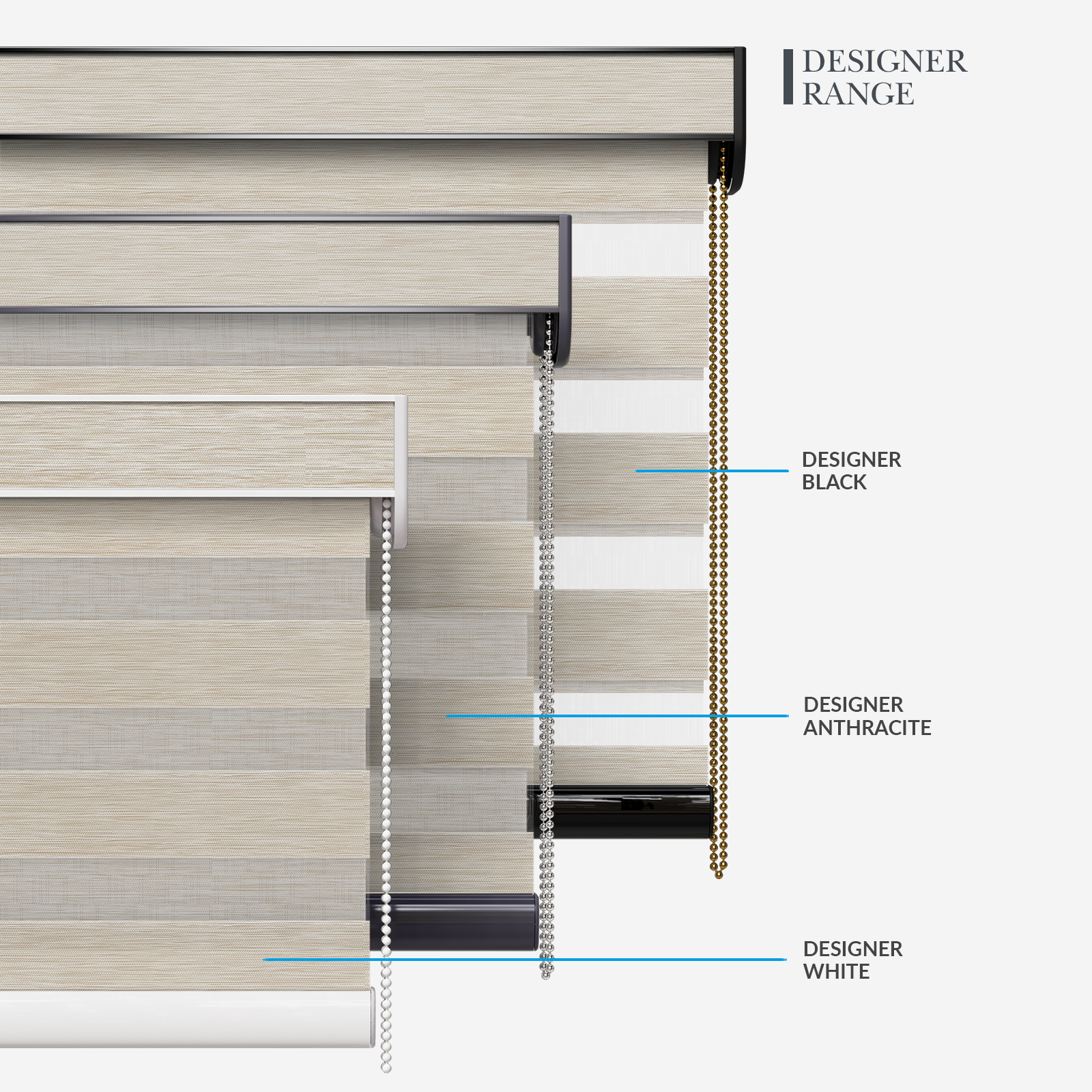 Embrace the timeless elegance of classic day & night blinds or enhance your décor with our stylish upgrade options. The Designer style features a refined touch of your chosen fabric on the headrail and a sleek bottom bar, with three chic colour options to choose from. For a more luxurious option, the Platinum upgrade offers six hardware colours, providing a truly personalised finish. Whichever you choose, all options promise to bring a stylish and sophisticated touch to any room!