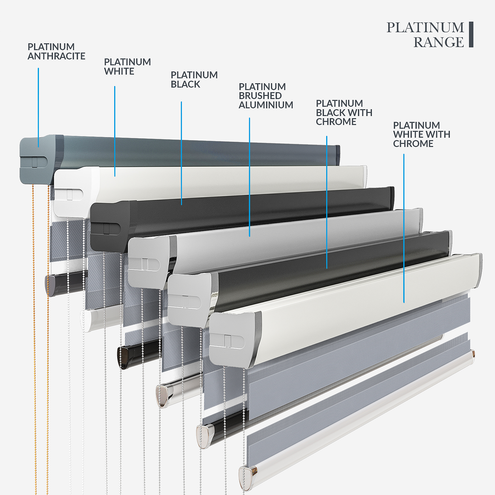 Embrace the timeless elegance of classic day & night blinds or enhance your décor with our stylish upgrade options. The Designer style features a refined touch of your chosen fabric on the headrail and a sleek bottom bar, with three chic colour options to choose from. For a more luxurious option, the Platinum upgrade offers six hardware colours, providing a truly personalised finish. Whichever you choose, all options promise to bring a stylish and sophisticated touch to any room!
