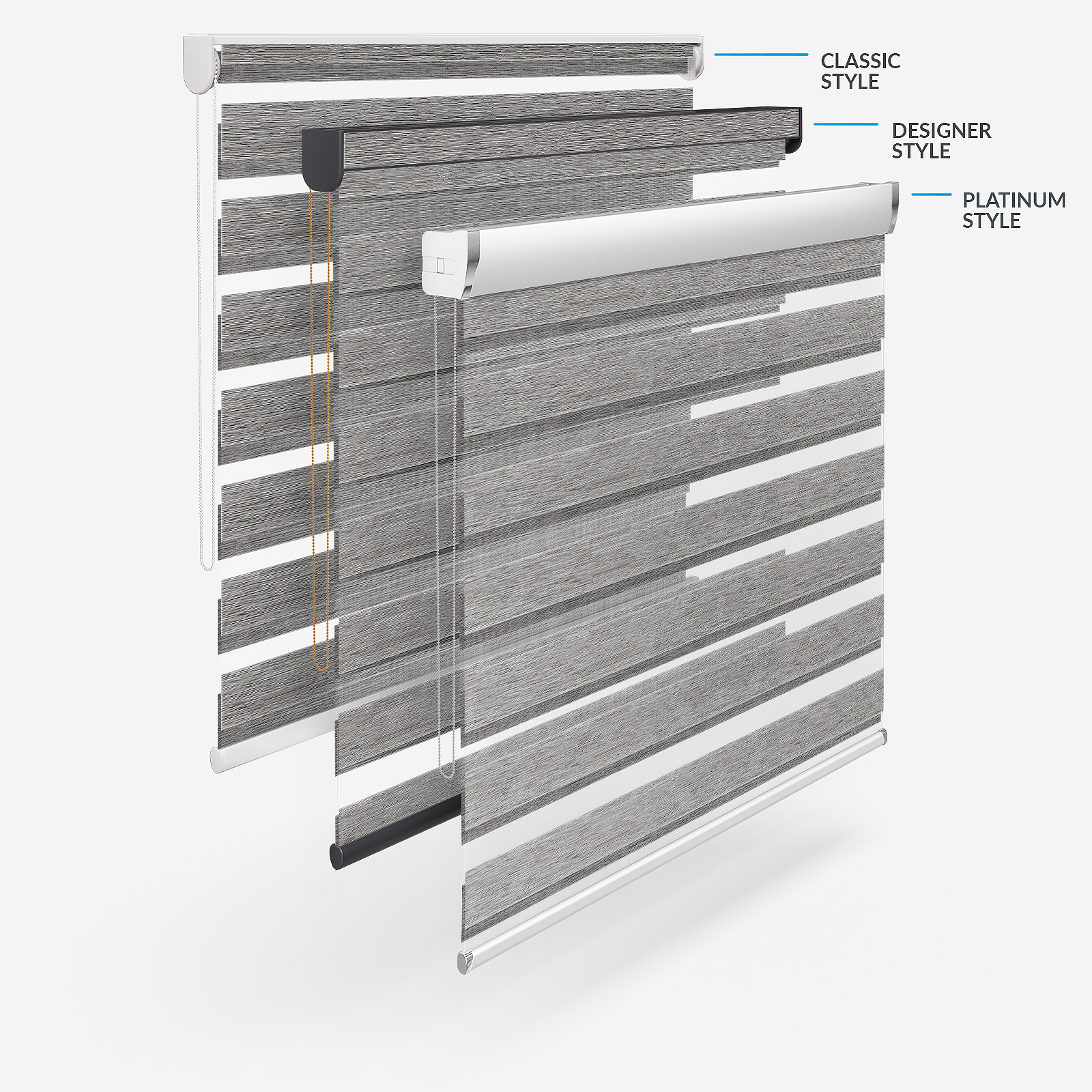Embrace the timeless elegance of classic day & night blinds or enhance your décor with our stylish upgrade options. The Designer style features a refined touch of your chosen fabric on the headrail and a sleek bottom bar, with three chic colour options to choose from. For a more luxurious option, the Platinum upgrade offers six hardware colours, providing a truly personalised finish. Whichever you choose, all options promise to bring a stylish and sophisticated touch to any room!