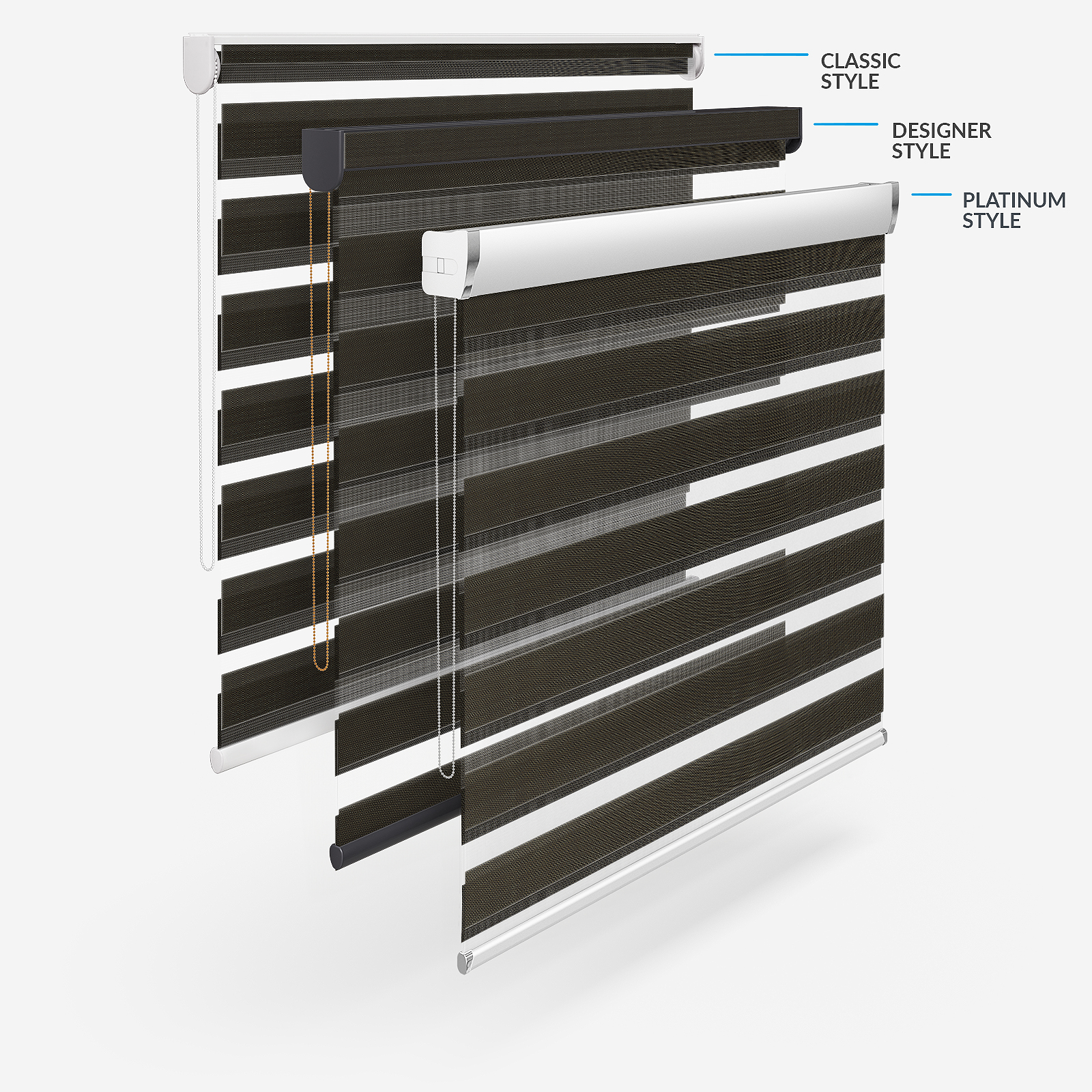 Embrace the timeless elegance of classic day & night blinds or enhance your décor with our stylish upgrade options. The Designer style features a refined touch of your chosen fabric on the headrail and a sleek bottom bar, with three chic colour options to choose from. For a more luxurious option, the Platinum upgrade offers six hardware colours, providing a truly personalised finish. Whichever you choose, all options promise to bring a stylish and sophisticated touch to any room!