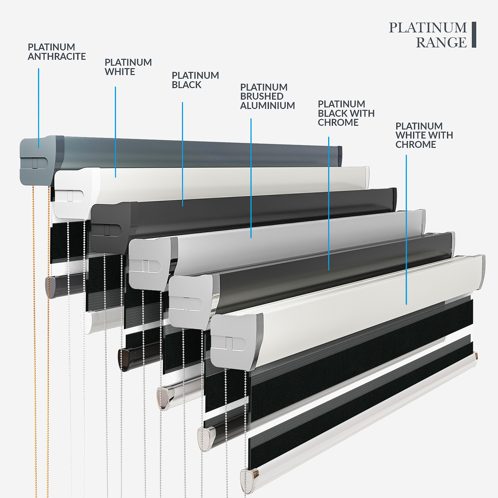 Embrace the timeless elegance of classic day & night blinds or enhance your décor with our stylish upgrade options. The Designer style features a refined touch of your chosen fabric on the headrail and a sleek bottom bar, with three chic colour options to choose from. For a more luxurious option, the Platinum upgrade offers six hardware colours, providing a truly personalised finish. Whichever you choose, all options promise to bring a stylish and sophisticated touch to any room!