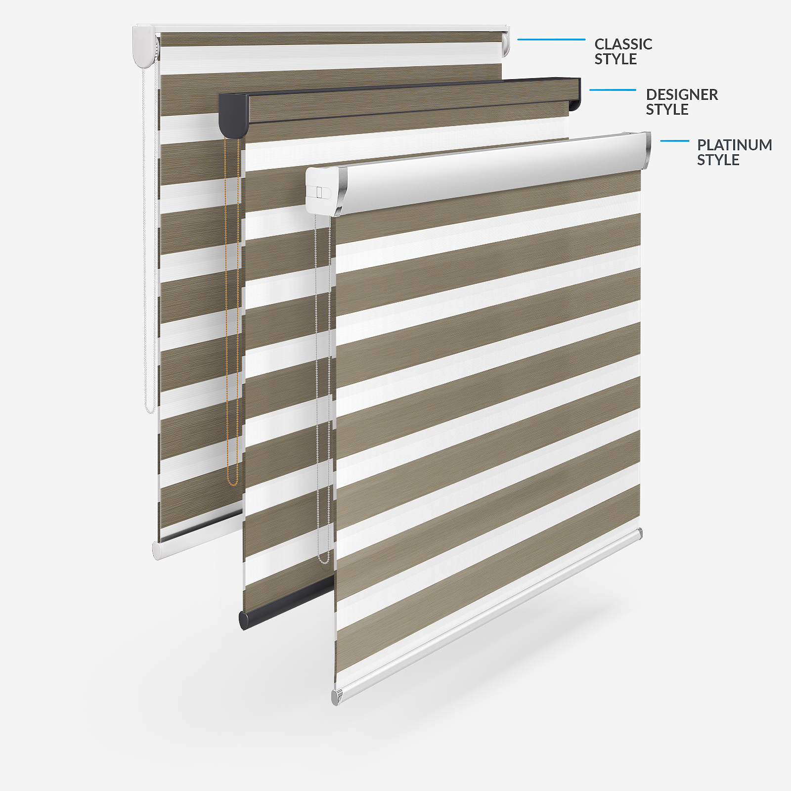 Embrace the timeless elegance of classic day & night blinds or enhance your décor with our stylish upgrade options. The Designer style features a refined touch of your chosen fabric on the headrail and a sleek bottom bar, with three chic colour options to choose from. For a more luxurious option, the Platinum upgrade offers six hardware colours, providing a truly personalised finish. Whichever you choose, all options promise to bring a stylish and sophisticated touch to any room!
