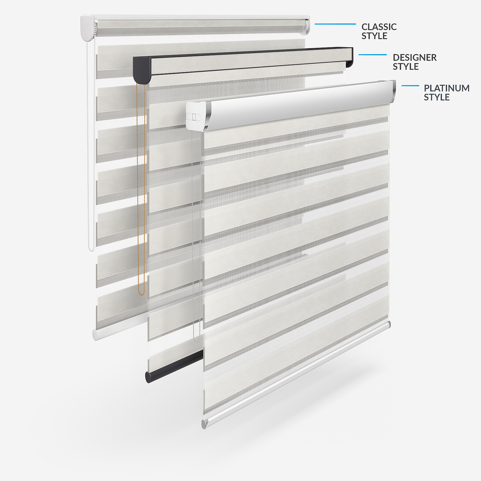 Embrace the timeless elegance of classic day & night blinds or enhance your décor with our stylish upgrade options. The Designer style features a refined touch of your chosen fabric on the headrail and a sleek bottom bar, with three chic colour options to choose from. For a more luxurious option, the Platinum upgrade offers six hardware colours, providing a truly personalised finish. Whichever you choose, all options promise to bring a stylish and sophisticated touch to any room!