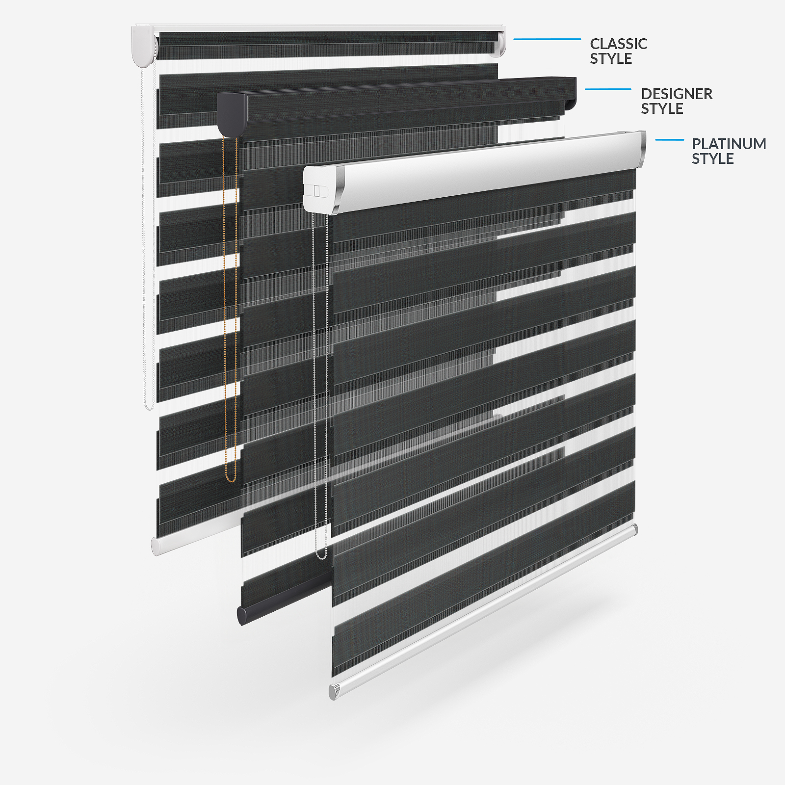 Embrace the timeless elegance of classic day & night blinds or enhance your décor with our stylish upgrade options. The Designer style features a refined touch of your chosen fabric on the headrail and a sleek bottom bar, with three chic colour options to choose from. For a more luxurious option, the Platinum upgrade offers six hardware colours, providing a truly personalised finish. Whichever you choose, all options promise to bring a stylish and sophisticated touch to any room!