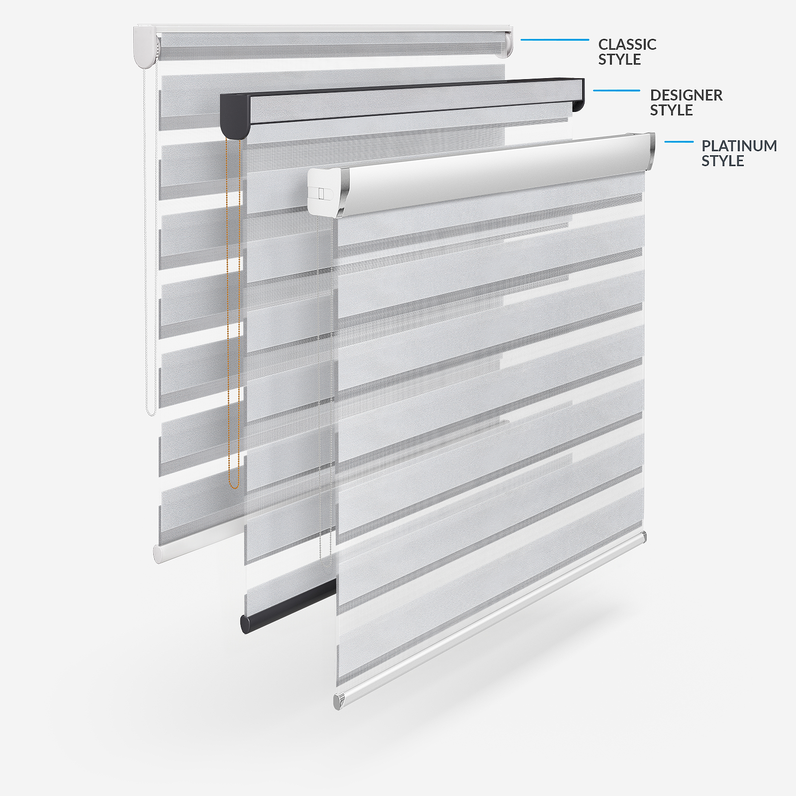 Embrace the timeless elegance of classic day & night blinds or enhance your décor with our stylish upgrade options. The Designer style features a refined touch of your chosen fabric on the headrail and a sleek bottom bar, with three chic colour options to choose from. For a more luxurious option, the Platinum upgrade offers six hardware colours, providing a truly personalised finish. Whichever you choose, all options promise to bring a stylish and sophisticated touch to any room!