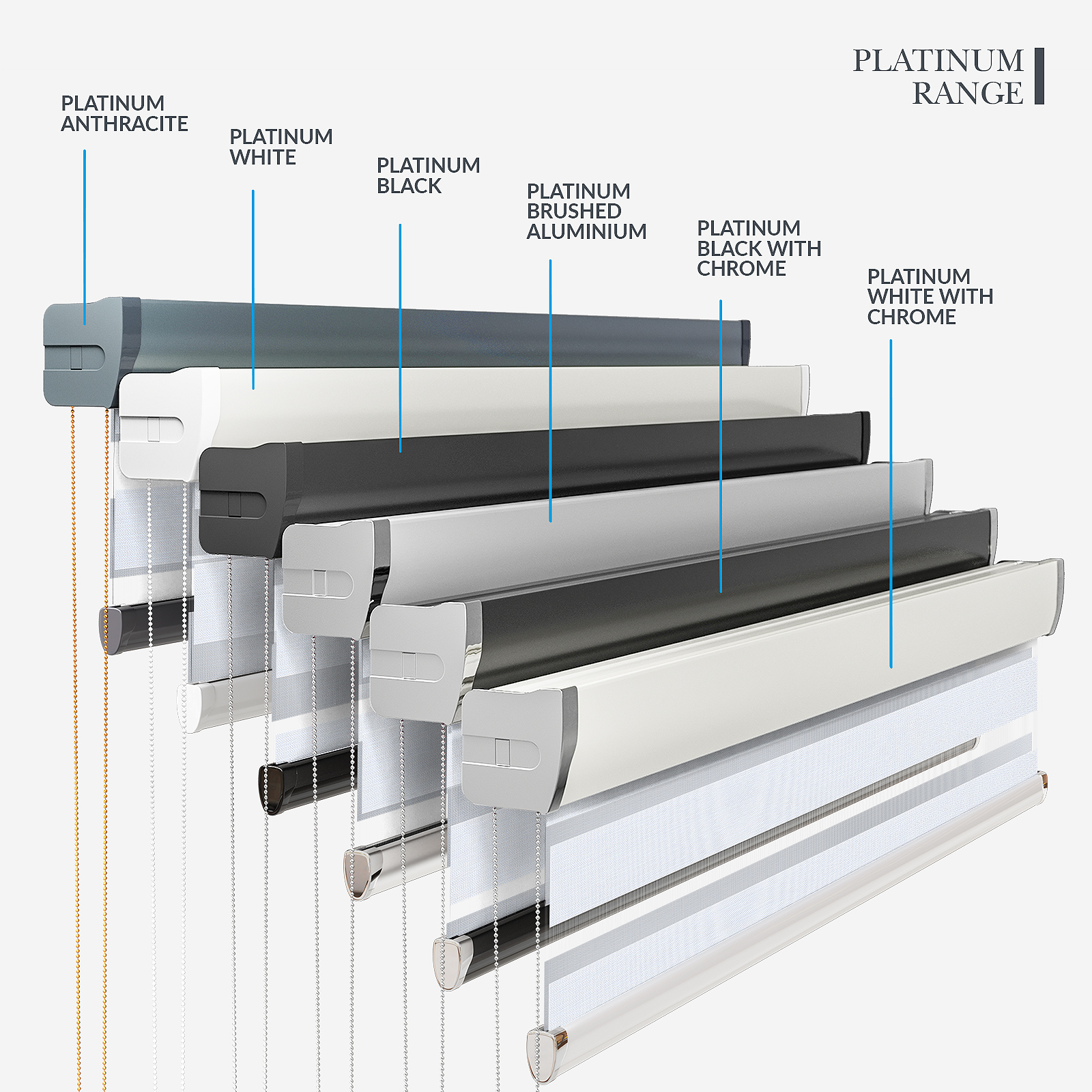 Embrace the timeless elegance of classic day & night blinds or enhance your décor with our stylish upgrade options. The Designer style features a refined touch of your chosen fabric on the headrail and a sleek bottom bar, with three chic colour options to choose from. For a more luxurious option, the Platinum upgrade offers six hardware colours, providing a truly personalised finish. Whichever you choose, all options promise to bring a stylish and sophisticated touch to any room!