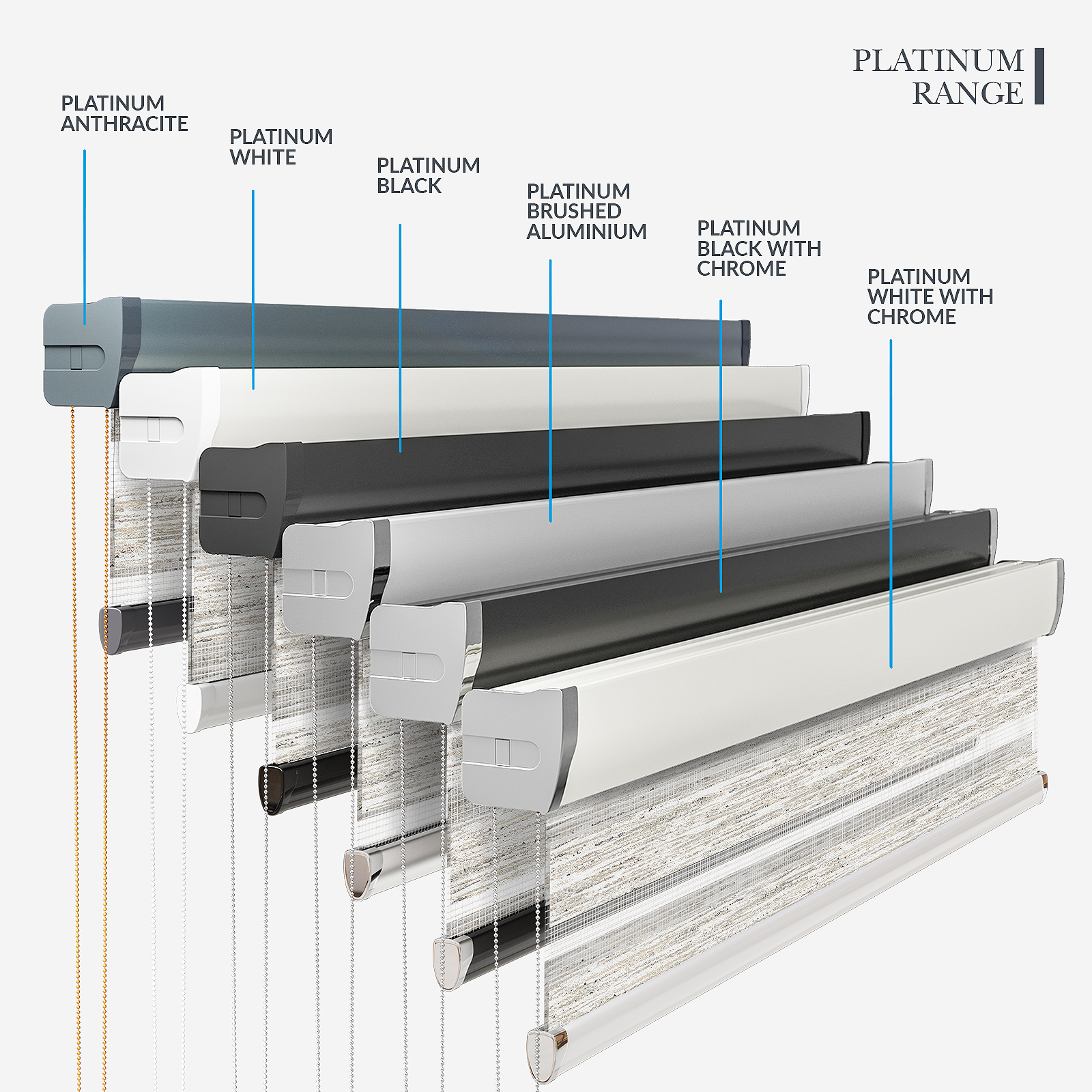 Embrace the timeless elegance of classic day & night blinds or enhance your décor with our stylish upgrade options. The Designer style features a refined touch of your chosen fabric on the headrail and a sleek bottom bar, with three chic colour options to choose from. For a more luxurious option, the Platinum upgrade offers six hardware colours, providing a truly personalised finish. Whichever you choose, all options promise to bring a stylish and sophisticated touch to any room!