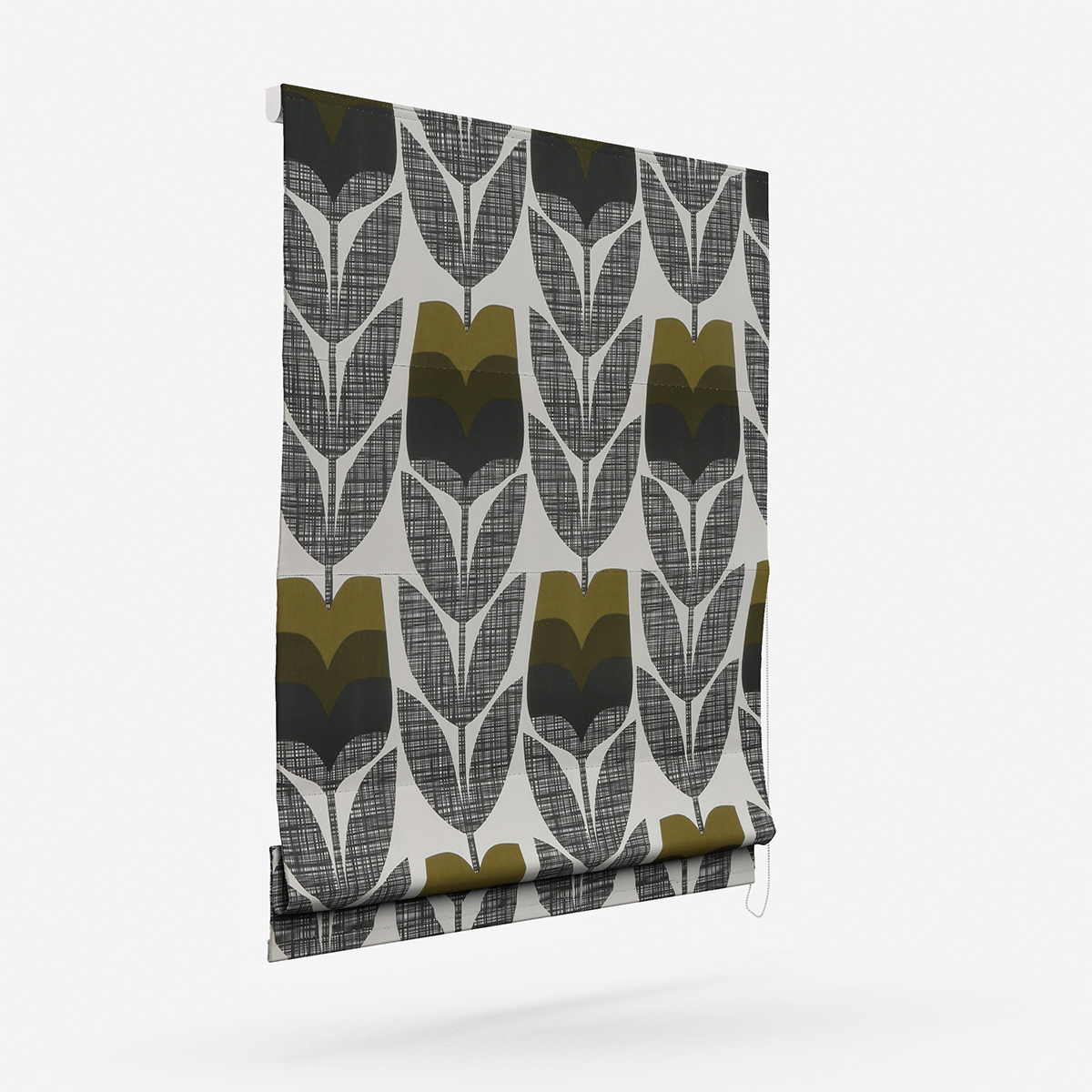 This elegant yet playful Roman blind showcases a modern graphic print in a cool colour way of olive green, moss, black and white. The perfect example of Orla Kiely's iconic retro style, the Rosebud Moss Roman blind is a brilliant choice for windows that deserve a little 60s-inspired charm.