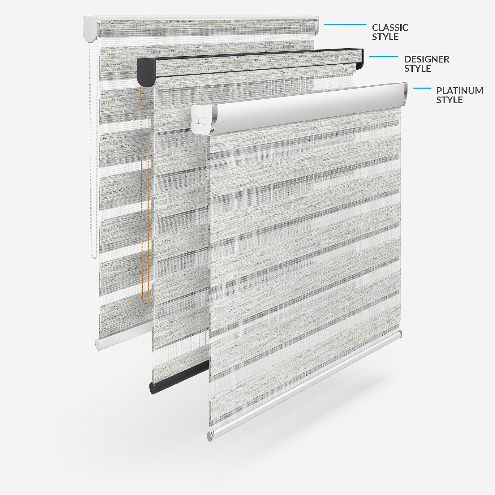 Embrace the timeless elegance of classic day & night blinds or enhance your décor with our stylish upgrade options. The Designer style features a refined touch of your chosen fabric on the headrail and a sleek bottom bar, with three chic colour options to choose from. For a more luxurious option, the Platinum upgrade offers six hardware colours, providing a truly personalised finish. Whichever you choose, all options promise to bring a stylish and sophisticated touch to any room!