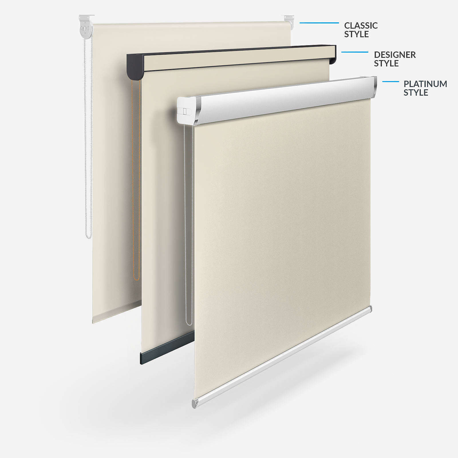While you can enjoy the timeless style of classic roller blinds, there are different styles available with Blinds Direct. The Designer style adds a little of your chosen fabric to the stylish headrail and a chic bottom bar while the Designer No Drill option captures the same beauty but without the need for drills or screws. Finally, the Platinum option gives the flexibility to add a fashionable finish to any room!