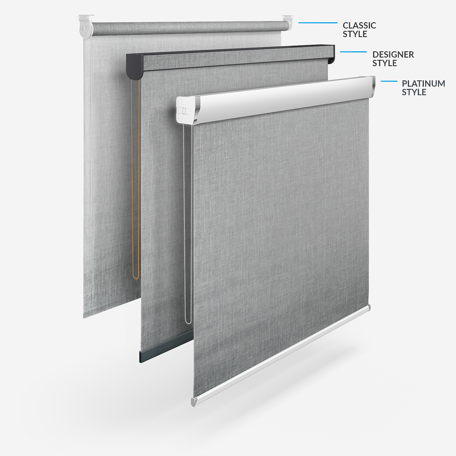 Be elegant with this Touched By Design Voga Blackout Smoke Grey roller blind. This beautiful and softly textured roller blind offers a more subtle and interesting take on roller blinds. And don't assume you need to use it on its own to dress your window, it will also look fantastic layered with curtains. With it's distinctive look and soft and supple weave, this blind will undoubtedly complement your interior and fit with your personal taste. You'll also find it easy to clean, simply use the upholstery brush attachment on your vacuum cleaner for regular cleaning. This roller blind features an elegant and trending smoke grey colour that will bring interest to your home and add a stylish finishing touch to your decor. We are proud to manufacture our products right here in the UK, where our experienced team are committed to producing only the best interior furnishings. Beyond the flexibility to have your blinds made to your exact specifications, you can also pick from four different styles! There is the time-tested Classic style, the fashionable Designer style that helps you maximise your chosen fabric in the headrail and the chic, sleek Platinum style. The fourth option is the Designer No Drill style. This combines the beauty of a Designer roller blind without the need for drills or screws!