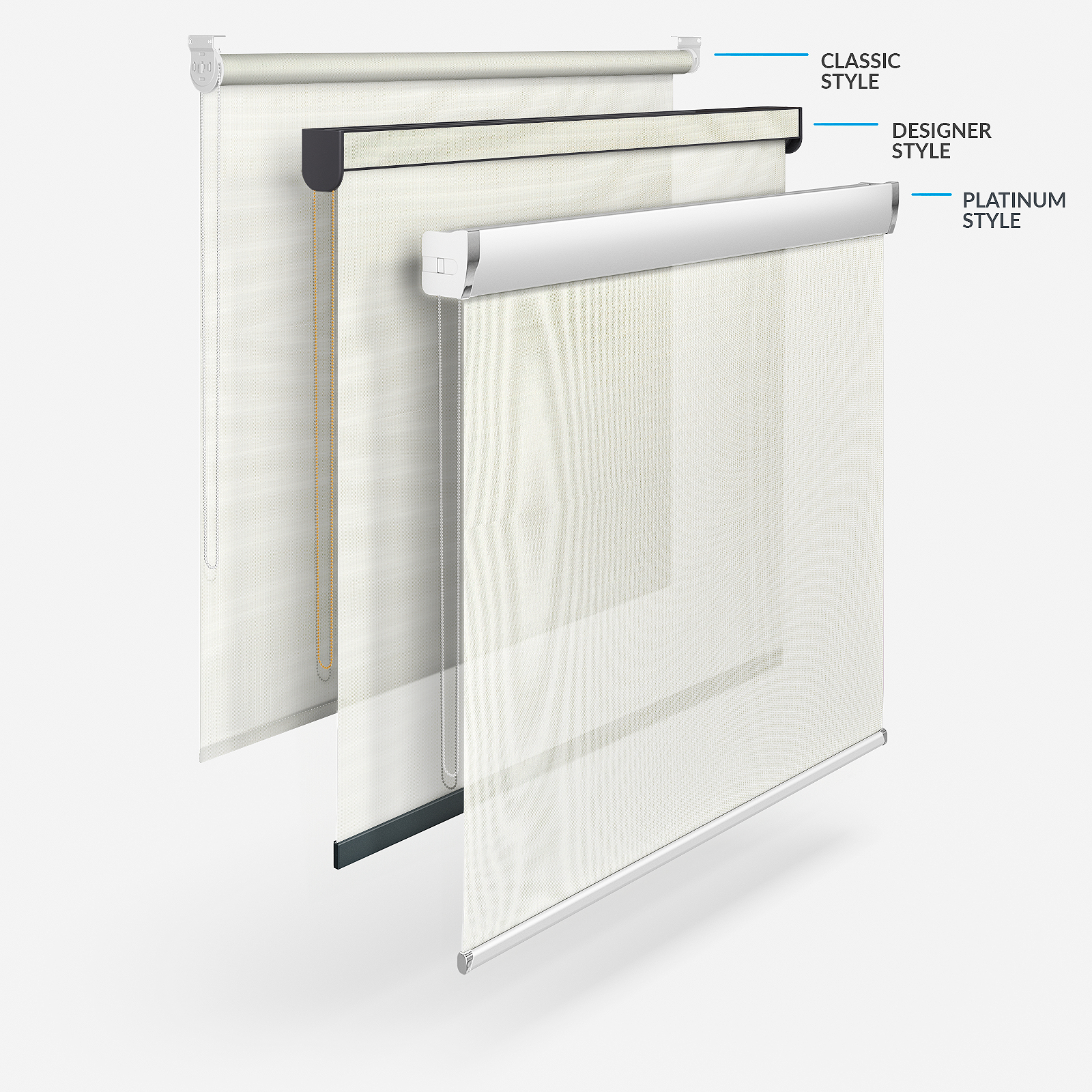 Beyond the flexibility to have your blinds made to your exact specifications, you can also pick from four different styles! There is the time-tested Classic style, the fashionable Designer style that helps you maximise your chosen fabric in the headrail and the chic, sleek Platinum style. The fourth option is the Designer No Drill style. This combines the beauty of a Designer roller blind without the need for drills or screws!