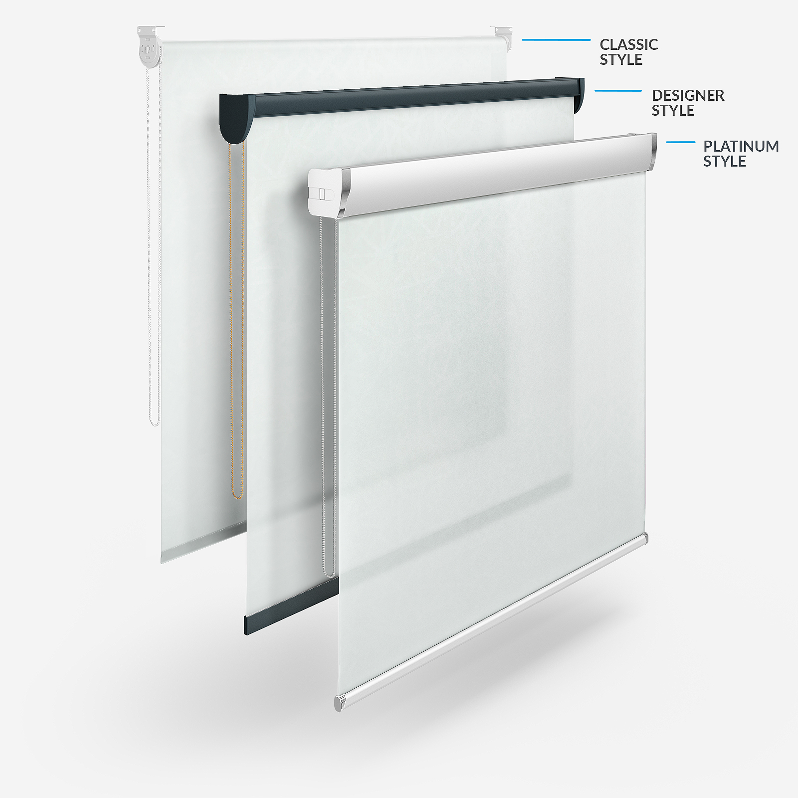 Beyond the flexibility to have your blinds made to your exact specifications, you can also pick from four different styles! There is the time-tested Classic style, the fashionable Designer style that helps you maximise your chosen fabric in the headrail and the chic, sleek Platinum style. The fourth option is the Designer No Drill style. This combines the beauty of a Designer roller blind without the need for drills or screws!
