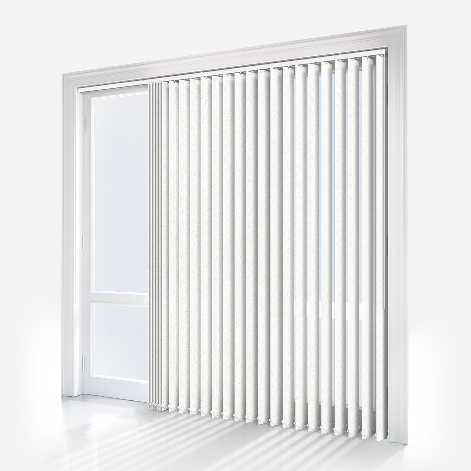 White vertical blinds are stylish accompaniments to both home and office decors. Made from 100% polyester, this dimout fabric promises to both maintain your privacy and help to keep sunlight from entering the room when closed; an easy-wipe fabric, Aspects Moreton White is a vertical blind that is incredibly easy to clean and maintain, promising years of quality.