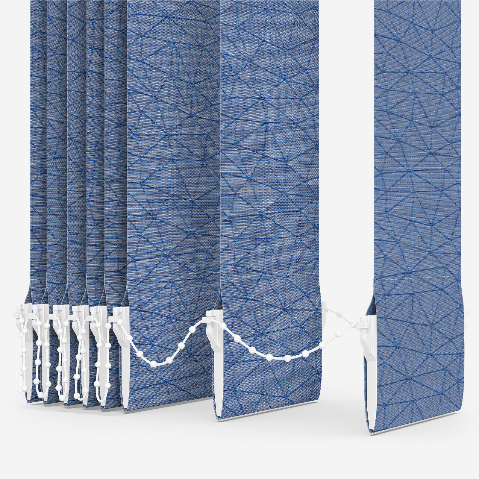This vertical blind displays an attractive patterned design, along with a pleasant ocean shade that brings style and excitement to the space.