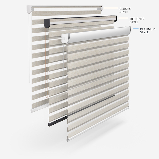 Embrace the timeless elegance of classic day & night blinds or enhance your décor with our stylish upgrade options. The Designer style features a refined touch of your chosen fabric on the headrail and a sleek bottom bar, with three chic colour options to choose from. For a more luxurious option, the Platinum upgrade offers six hardware colours, providing a truly personalised finish. Whichever you choose, all options promise to bring a stylish and sophisticated touch to any room!