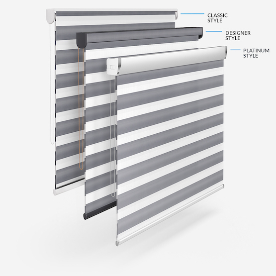 Touched By Design Nova Urban Grey Embrace the timeless elegance of classic day & night blinds or enhance your décor with our stylish upgrade options. The Designer style features a refined touch of your chosen fabric on the headrail and a sleek bottom bar, with three chic colour options to choose from. For a more luxurious option, the Platinum upgrade offers six hardware colours, providing a truly personalised finish. Whichever you choose, all options promise to bring a stylish and sophisticated touch to any room!