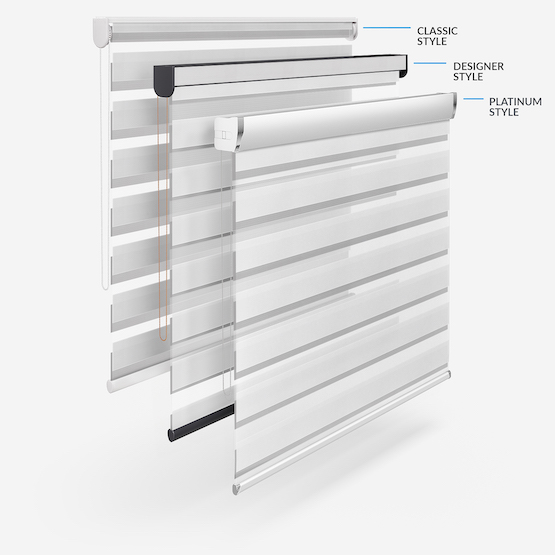Embrace the timeless elegance of classic day & night blinds or enhance your décor with our stylish upgrade options. The Designer style features a refined touch of your chosen fabric on the headrail and a sleek bottom bar, with three chic colour options to choose from. For a more luxurious option, the Platinum upgrade offers six hardware colours, providing a truly personalised finish. Whichever you choose, all options promise to bring a stylish and sophisticated touch to any room!