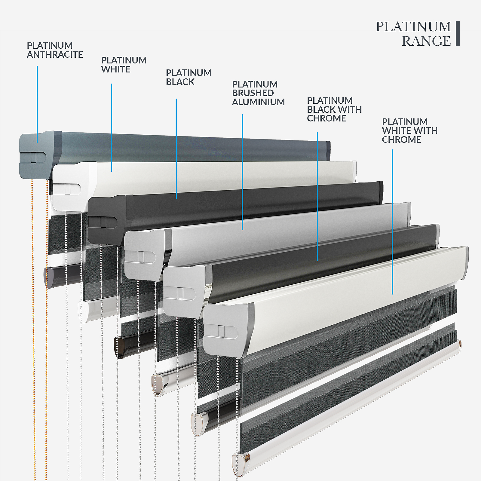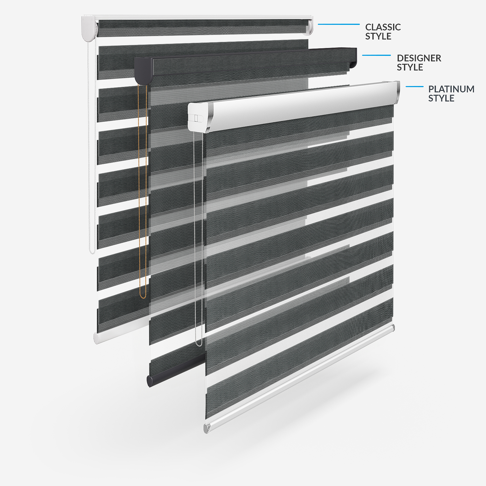 Embrace the timeless elegance of classic day & night blinds or enhance your décor with our stylish upgrade options. The Designer style features a refined touch of your chosen fabric on the headrail and a sleek bottom bar, with three chic colour options to choose from. For a more luxurious option, the Platinum upgrade offers six hardware colours, providing a truly personalised finish. Whichever you choose, all options promise to bring a stylish and sophisticated touch to any room!