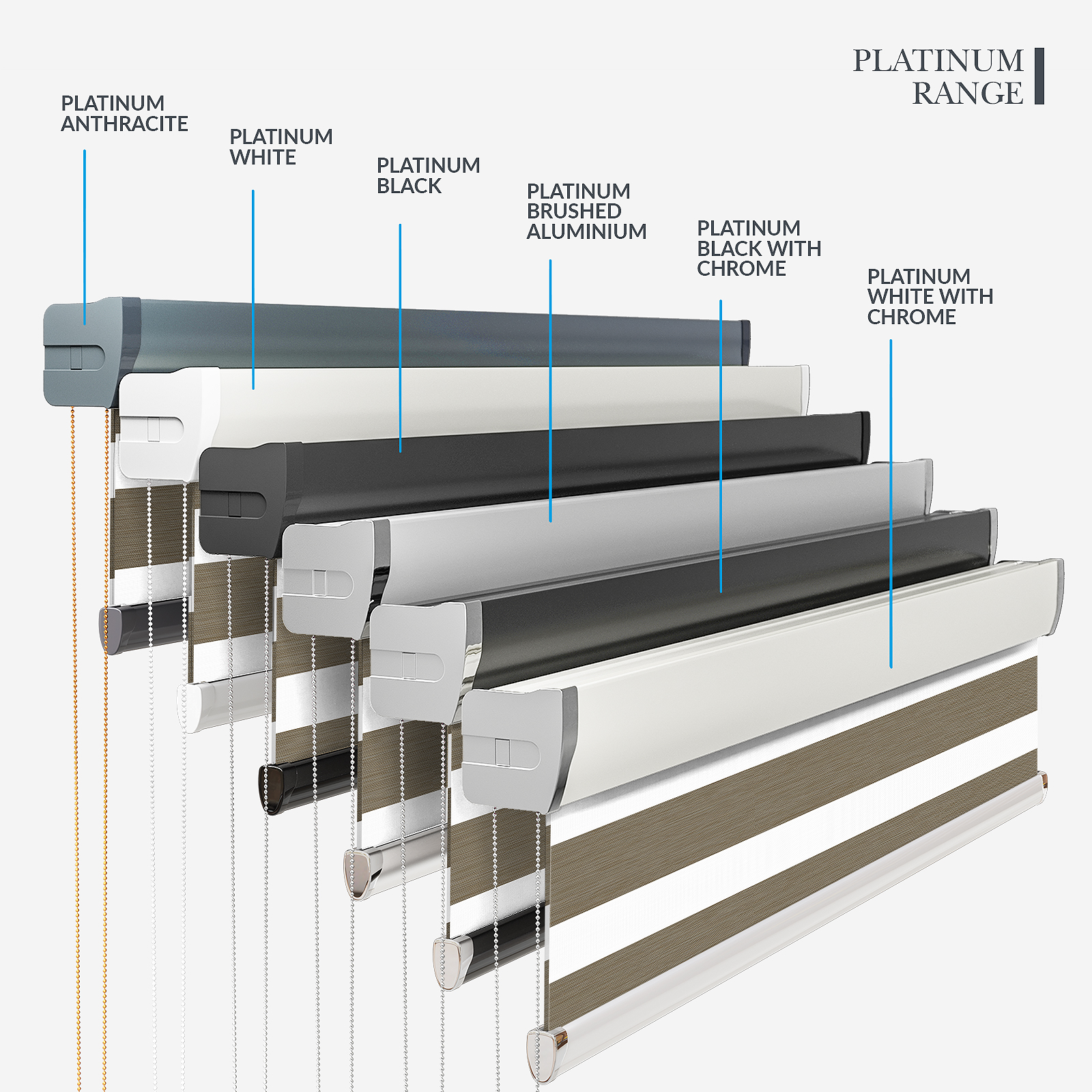 Embrace the timeless elegance of classic day & night blinds or enhance your décor with our stylish upgrade options. The Designer style features a refined touch of your chosen fabric on the headrail and a sleek bottom bar, with three chic colour options to choose from. For a more luxurious option, the Platinum upgrade offers six hardware colours, providing a truly personalised finish. Whichever you choose, all options promise to bring a stylish and sophisticated touch to any room!