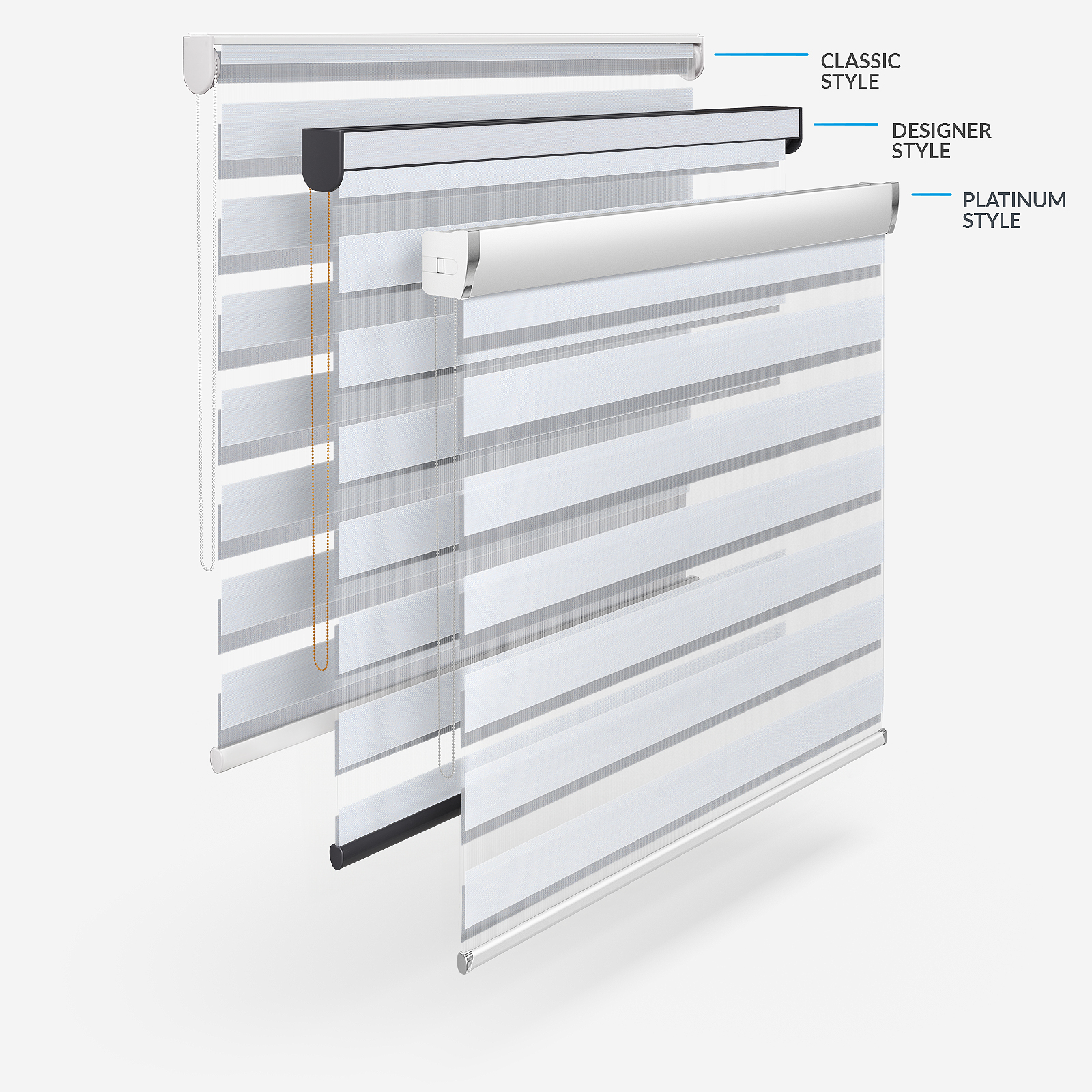Embrace the timeless elegance of classic day & night blinds or enhance your décor with our stylish upgrade options. The Designer style features a refined touch of your chosen fabric on the headrail and a sleek bottom bar, with three chic colour options to choose from. For a more luxurious option, the Platinum upgrade offers six hardware colours, providing a truly personalised finish. Whichever you choose, all options promise to bring a stylish and sophisticated touch to any room!