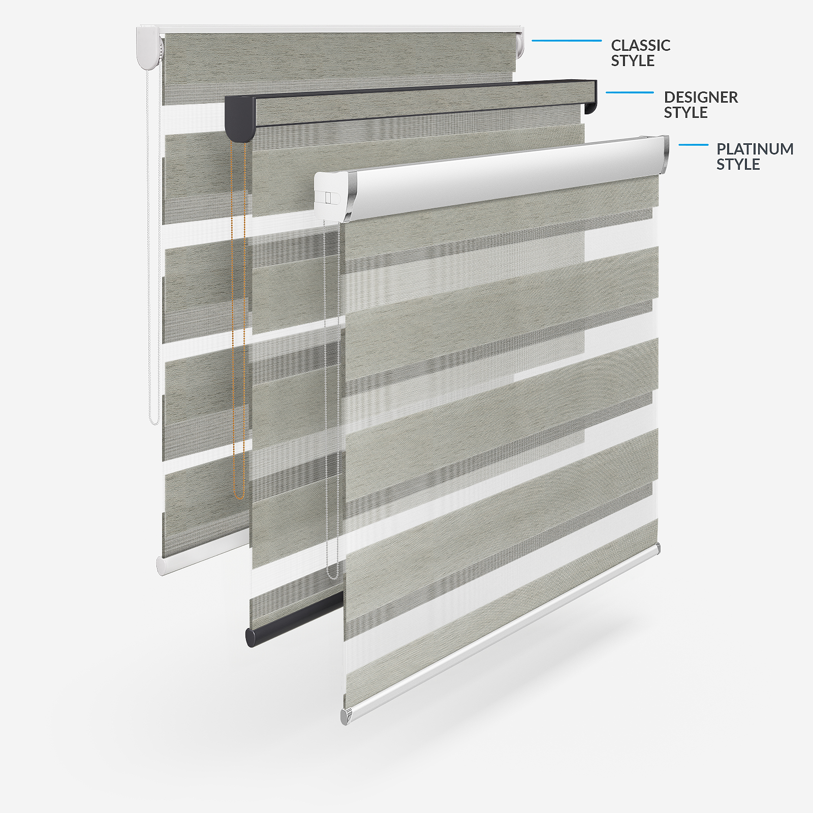 Embrace the timeless elegance of classic day & night blinds or enhance your décor with our stylish upgrade options. The Designer style features a refined touch of your chosen fabric on the headrail and a sleek bottom bar, with three chic colour options to choose from. For a more luxurious option, the Platinum upgrade offers six hardware colours, providing a truly personalised finish. Whichever you choose, all options promise to bring a stylish and sophisticated touch to any room!