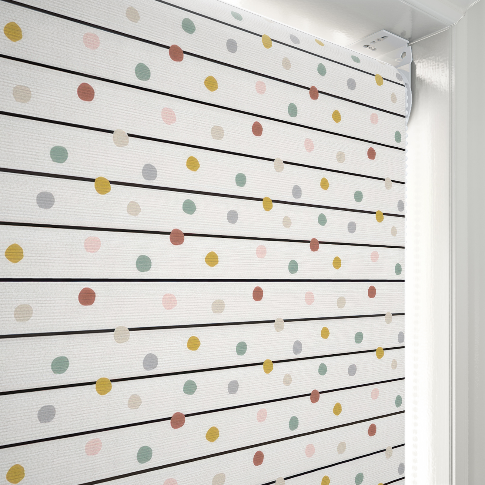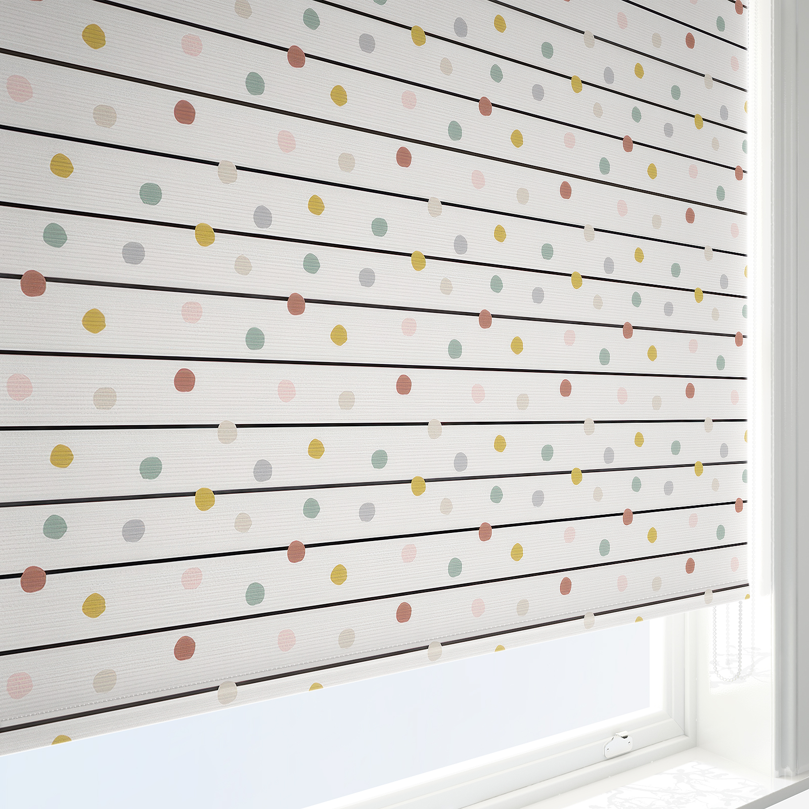 Bring playfulness to your interior with this Sonova Studio Dotty Stripe Pastel roller blind. Bringing style to your interior and the rest of your space, this roller blind is a brilliant choice for achieving a sleek and elegant look. There are also many practical benefits, such as light control, thermal efficiency and durability. Bring the beauty of pastel into your space with this smart roller blind, which features an ever-stylish childrens pattern design. At Blinds Direct, we manufacture our products in the UK. Every item is made to measure to your exact requirements, so you can enjoy a product that fits your home perfectly.