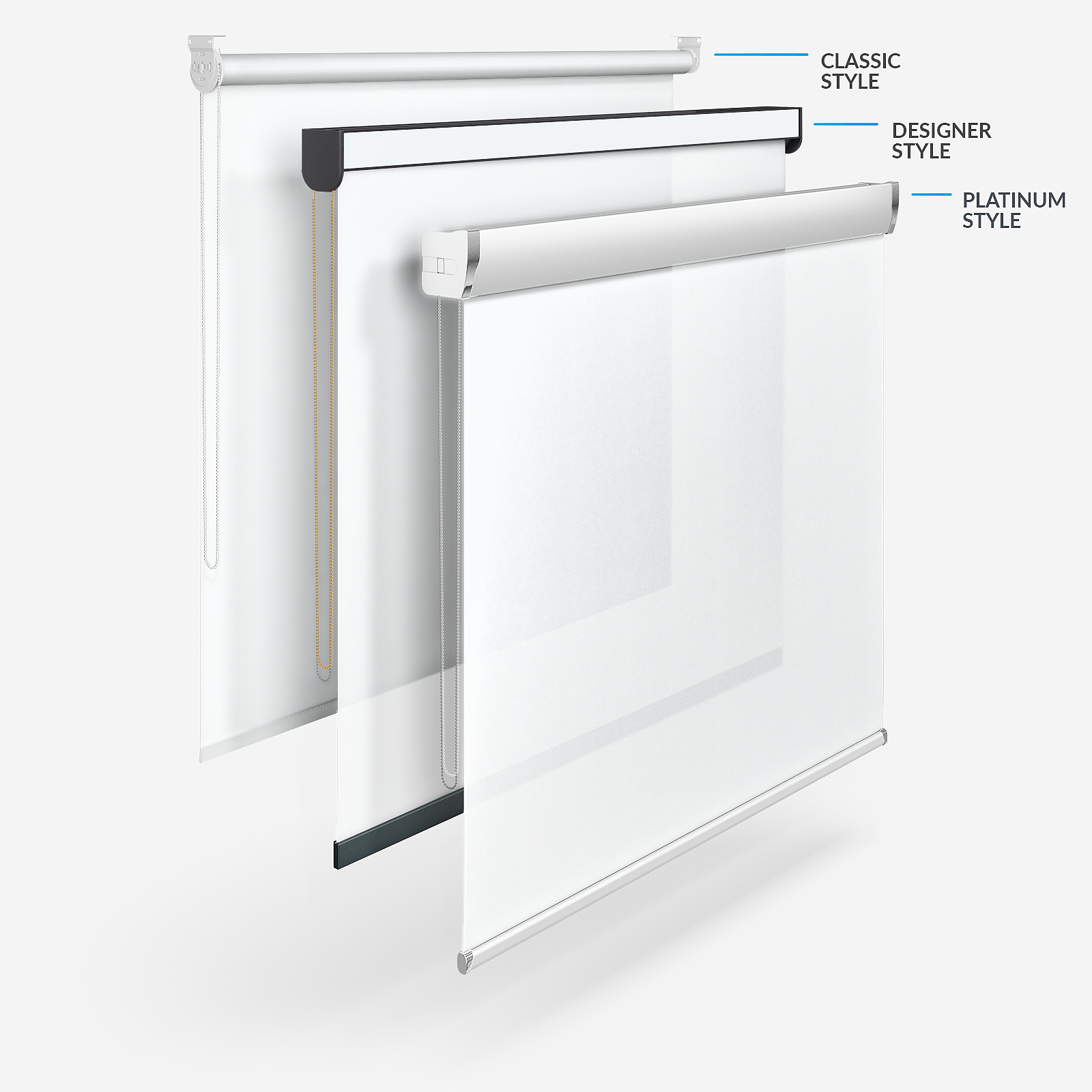 Beyond the flexibility to have your blinds made to your exact specifications, you can also pick from four different styles! There is the time-tested Classic style, the fashionable Designer style that helps you maximise your chosen fabric in the headrail and the chic, sleek Platinum style. The fourth option is the Designer No Drill style. This combines the beauty of a Designer roller blind without the need for drills or screws!