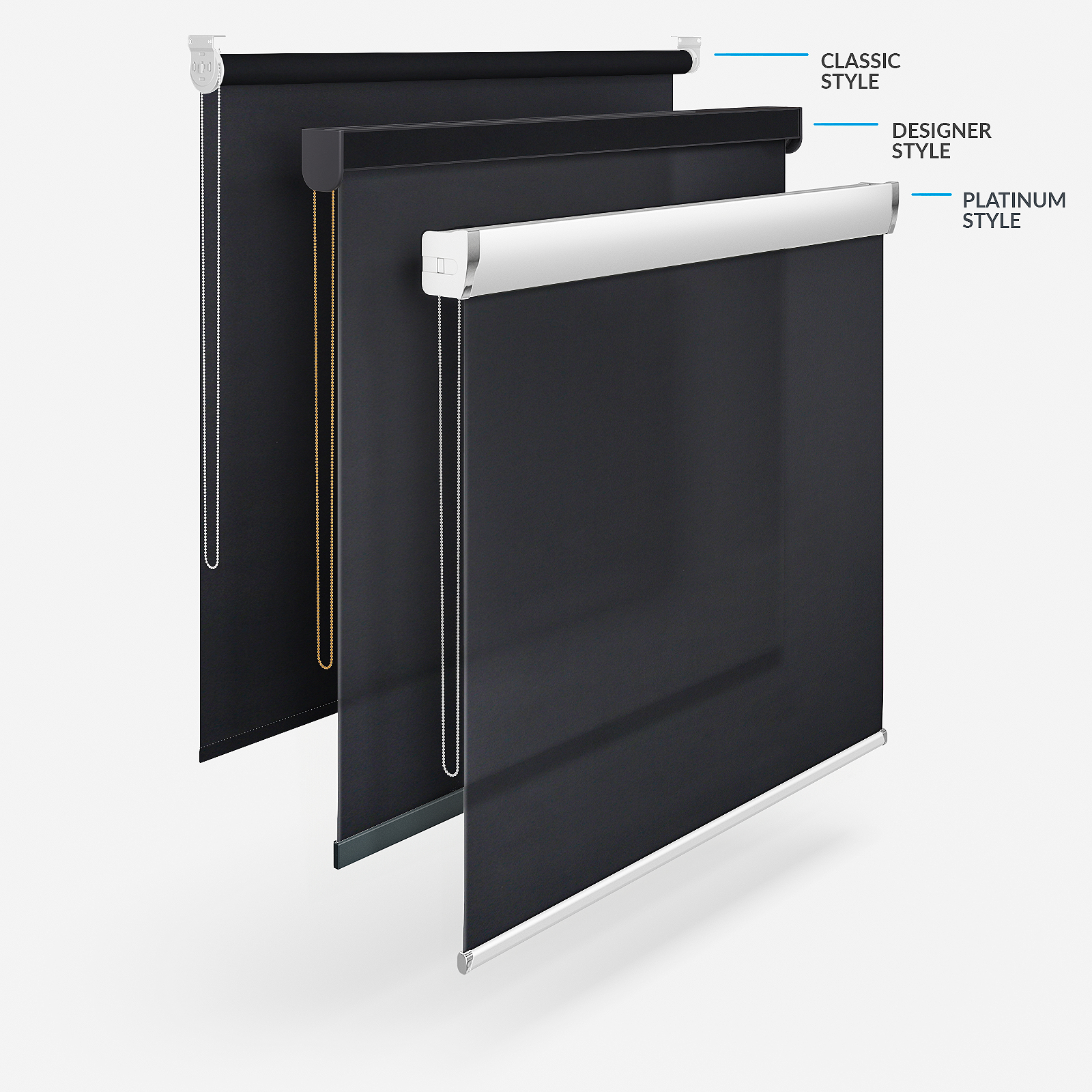 Stand out with this made to measure Deluxe Plain Jet Roller Blind. Part of our exclusive Touched By Design range, this bold colour is ideal for creating a modern, elegant look while adding subtle depth to any room in the house. Its striking black colour and sleek finish provide a versatile tone that works with a number of colour palettes including, pink, blue, white and yellow. Practical and cost effective, the Deluxe Plain Jet Roller Blind is crafted from a high quality dimout fabric. Controlling the light by blocking harsh lights and only allowing a subtle glow to fill your room. At Blind Direct we supply simple to follow measuring and fitting guides to ensure the perfect fit. Each of our products are made to measure to your exact specifications right here in West Yorkshire. While you can enjoy the timeless style of classic roller blinds, there are different styles available with Blinds Direct. The Designer style adds a little of your chosen fabric to the stylish headrail and a chic bottom bar while the Designer No Drill option captures the same beauty but without the need for drills or screws. Finally, the Platinum option gives the flexibility to add a fashionable finish to any room! Touched by Design Deluxe Plain Jet