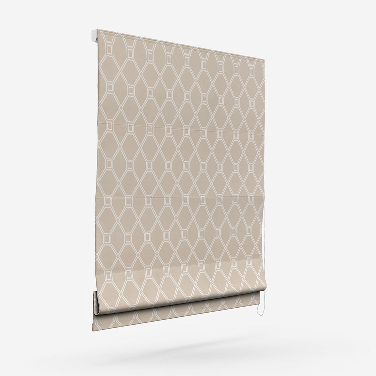 This roman blind displays an attractive geometric design, along with a pleasant natural shade that brings style and excitement to the space.