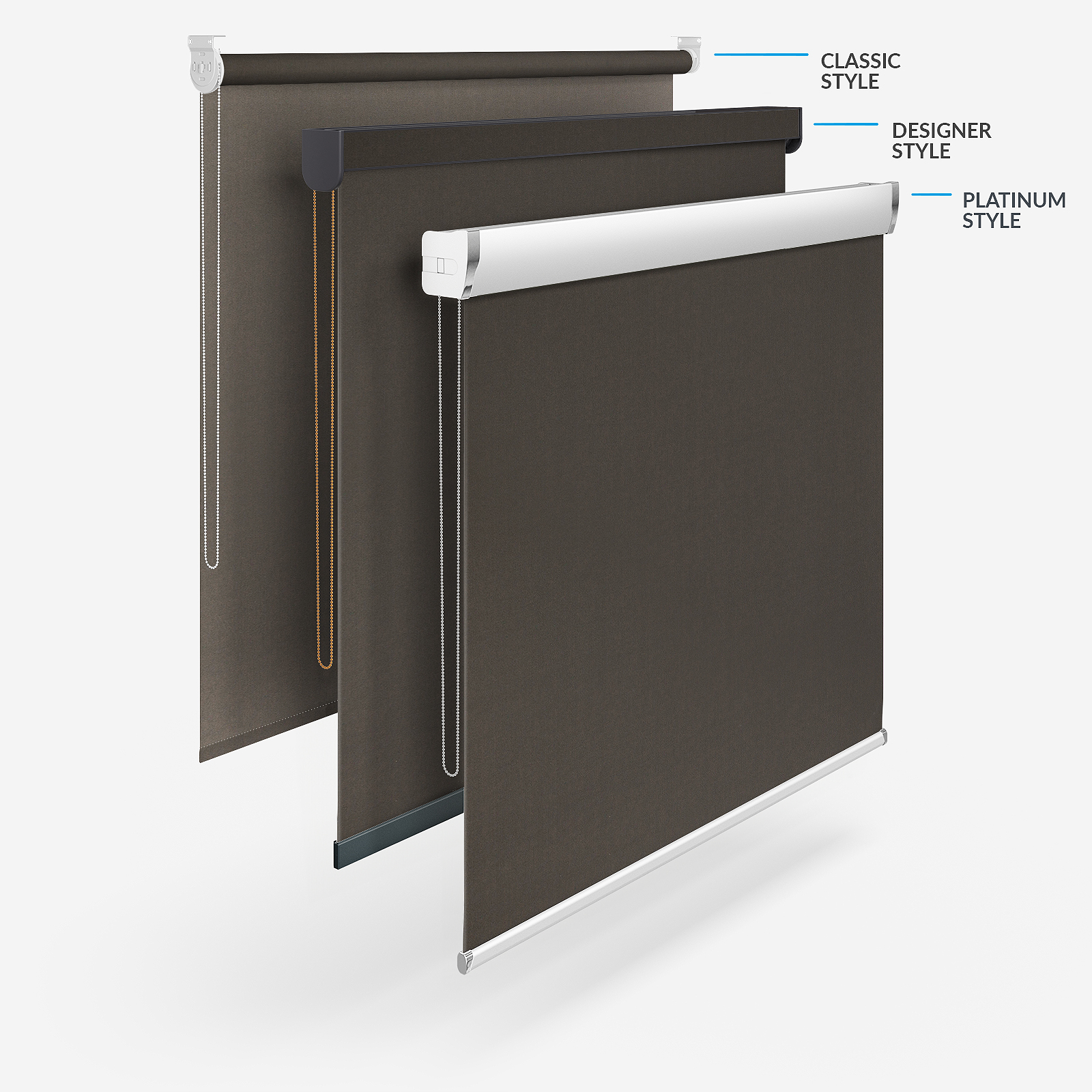 Add a touch of privacy with this Touched By Design Optima Blackout Brown roller blind. While you and your family enjoy the practical benefits of this roller blind, your room will also be lifted with the sleekness and style that can only be achieved with a high quality, made to measure window treatment. Enjoy the sophistication of a brown roller blind, featuring an up to date plain pattern that adds interest and depth. We take a great deal of pride in supplying our customers with nothing but the finest quality products at excellent prices. Beyond the flexibility to have your blinds made to your exact specifications, you can also pick from four different styles! There is the time-tested Classic style, the fashionable Designer style that helps you maximise your chosen fabric in the headrail and the chic, sleek Platinum style. The fourth option is the Designer No Drill style. This combines the beauty of a Designer roller blind without the need for drills or screws!