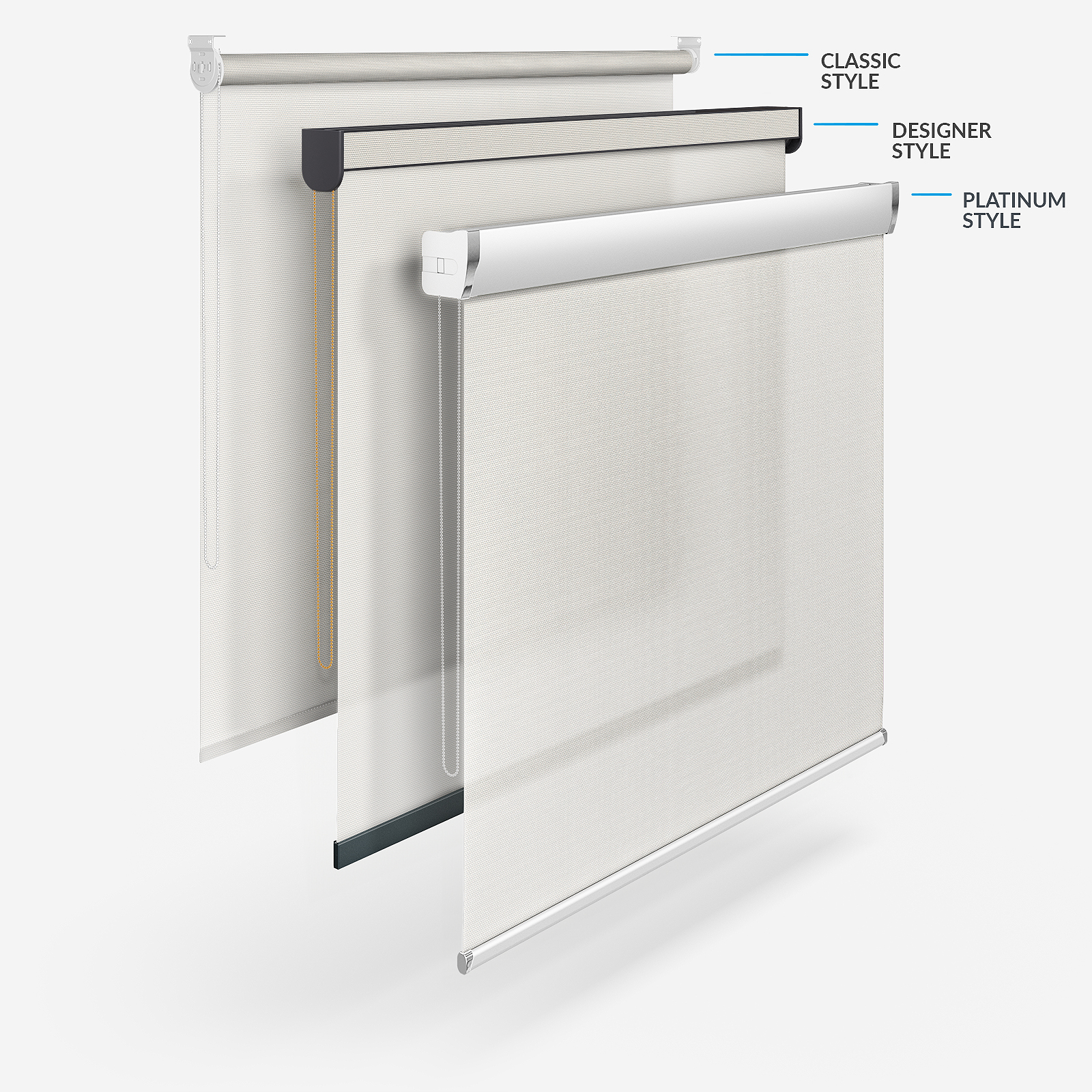 With Blinds Direct you can also enjoy different styles of roller blinds! There is the celebrated classic style, the Designer style which opens a range of customisation options including different coloured headrails and bottom bars, the easy to fit Designer No Drill and the stylish, sophisticated Platinum option. Each style creates a different effect that will help to maximise your home decor.